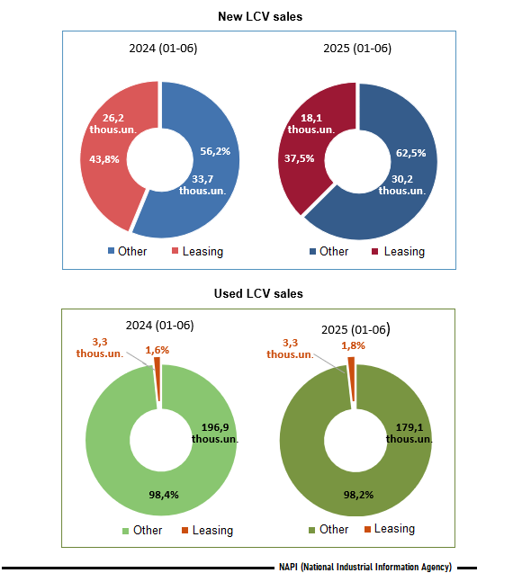 According to the marketing agency NAPI, in the first half of 2025, the new and used LCV* leasing fell by 27.7%: from 29.5 thousand units in January-June 2024 to 21.4 thousand units in January-June 2025. The new LCV leasing was down by 31% or 8.1 thousand units. At the same time, the new light commercial vehicle market decreased by only 19.4%. The share of LCV leased in the new vehicle market in January-June 2024 was 43.8% against 37.5% in the similar period of the current year. The share of used light commercial vehicles leased in the first half of last year reached only 1.6%, and in 2025 it increased to 1.8%.