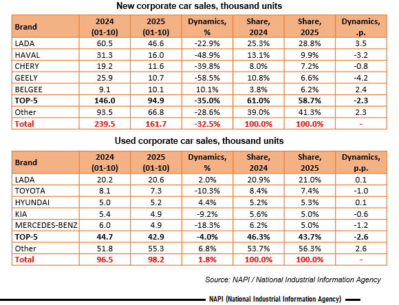 According to the marketing agency NAPI, 161.7 new and 98.2 used cars were sold to corporate clients in January-October 2025. New car sales decreased by 32.5% year-over-year. CHERY (-39.8%), HAVAL (-48.9%), and GEELY (-58.5%) sales fell below the market. BELGEE showed positive growth (+10.1%).