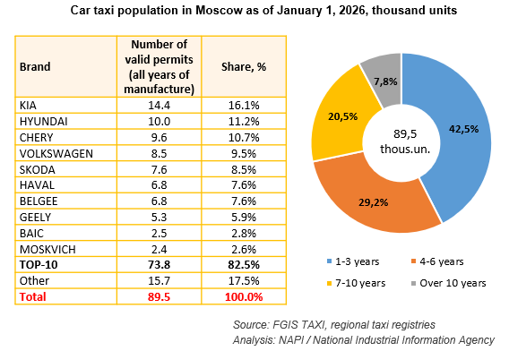 According to the marketing agency NAPI, as of January 1, 2026, the Moscow taxi population numbers 89.5 thousand cars with valid permits.