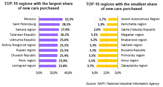 Over the year, Moscow (32.3%), Saint Petersburg (28.5%), and the Samara region (27%) became the regions with the largest share of new cars purchased in Russia. Meanwhile, the Jewish Autonomous Region and the Kamchatka region accounted for less than 2% of new car sales. The share of used cars in TOP-10 regions where they were purchased most often is more than 96%.