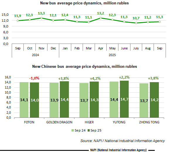 According to the marketing agency NAPI, the average price for new buses* decreased by 5.3% (from 11.9 million rubles to 11.3 million rubles) over the year, from September 2024 to September 2025. Over the month, from August to September of the current year, the price grew by 0.5%. Despite the year-over-year decline, average prices for a number of new Chinese buses increased. For example, the price for HIGER was up by 4.2%, ZHONG TONG and GOLDEN DRAGON - by 3.8%, and YUTONG - by 2.2%. Only FOTON saw a price decrease (-1%). Chinese buses appreciated by 322 thousand rubles on average: their price reached 573 thousand rubles.