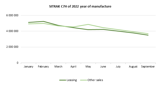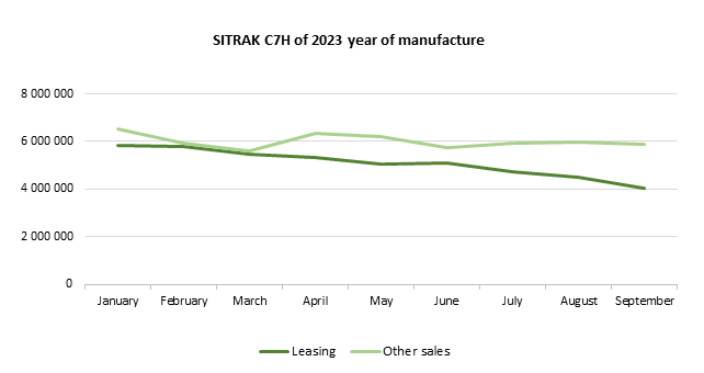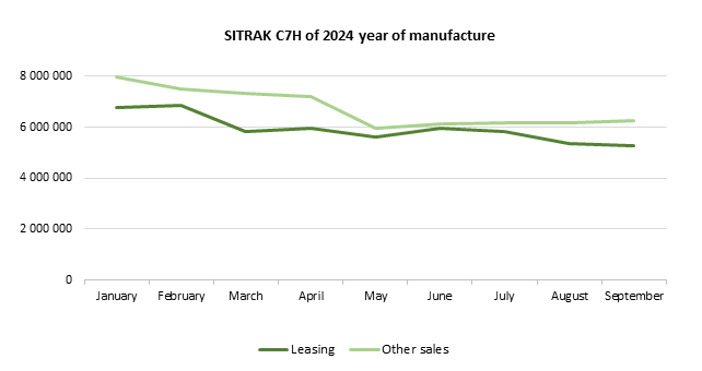 The marketing agency NAPI analyzed the dynamics of average prices for used SITRAK C7H, 4X2 tractor units manufactured in 2022-2024. Over the first nine months, from January to September 2025, the average price for SITRAK C7H tractor units manufactured in 2022 sold by leasing companies decreased by 31.8%, for those manufactured in 2023 - by 30.7%, and in 2024 - by 22%. The price for SITRAK C7H sold by dealers, independent sellers, and various vehicle owners also fell: by 25.1% for tractor units manufactured in 2022, by 9.7% for those manufactured in 2023, and by 21.5% for tractor units manufactured in 2024.