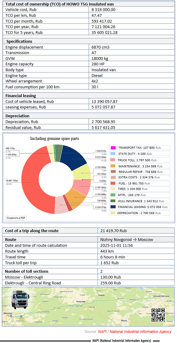 The cost of a trip by HOWO T5G from Nizhny Novgorod to Moscow is also calculated, taking into account the total cost of ownership.