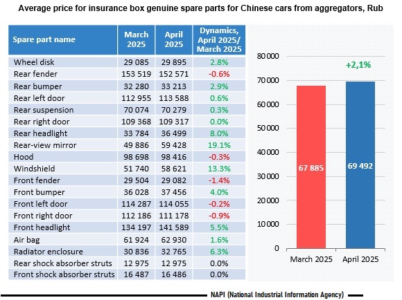 The marketing agency NAPI analyzed insurance box genuine spare parts’ prices for Chinese cars from aggregators. In April 2025, the average price for genuine spare parts increased by 2.1% on March 2025.