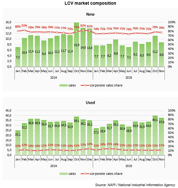 In January-November 2025, the share of new LCV sales to corporate customers varied between 74% and 79%, while that of used ones - from 11% to 15%.