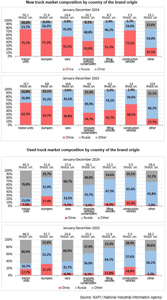 In the new truck sales composition, the share of Chinese vehicles fell in all segments. The sharpest decline was shown by dumper (-22.5 p.p.), tractor unit (-13.2 p.p.), and construction vehicle (-14.6 p.p.) segments. Despite the decline, in 2025, Chinese vehicles accounted for more than half of new truck sales in tractor unit (62.5%), construction vehicle (58.5%), dumper (54.7%), and van (50.8%) segments.