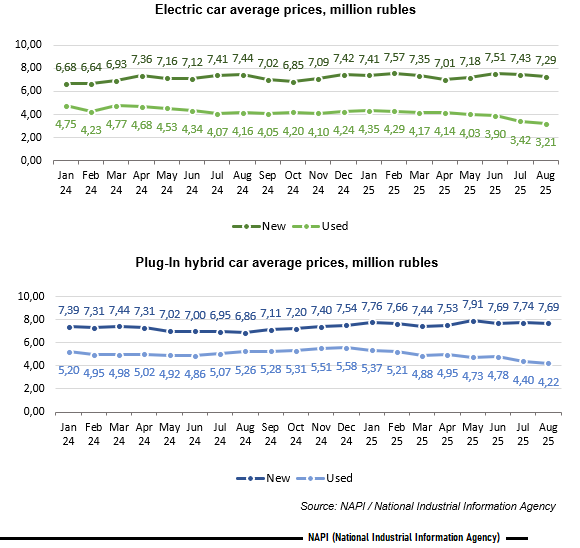 The marketing agency NAPI analyzed the dynamics of average prices for new and used electric and plug-in hybrid cars. Thus, over the month, from July to August 2025, the price for new electric cars decreased by 1.9% to 7.29 million rubles, while that for used ones - by 6.4% to 3.21 million rubles. The price for hybrid cars also fell - to 7.69 million rubles for new ones (-0.7%) and to 4.22 million rubles for used ones (-4.2%).