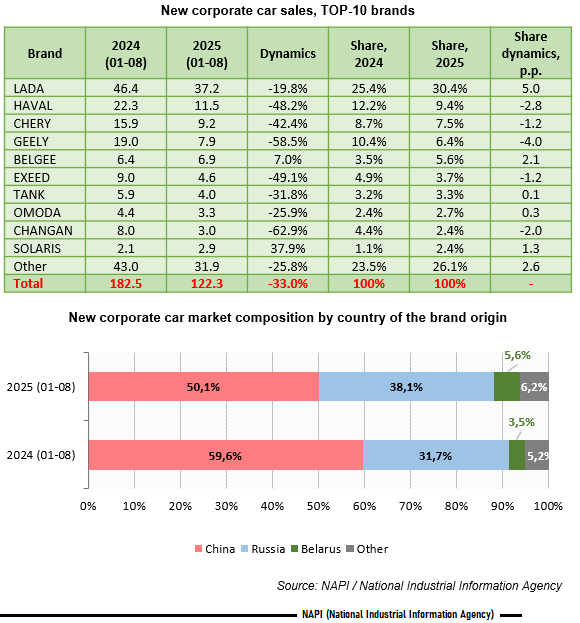 Over the first eight months of the current year, sales of corporate cars of Chinese CHANGAN (-62.9%) and GEELY (-58.5%) brands showed the sharpest decline. Sales of SOLARIS (37.9%) and BELGEE (7%) increased. LADA continues to account for the largest sales volume this year, with its share increasing from 25.4% to 30.4%.