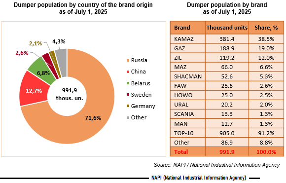 According to the marketing agency NAPI, as of July 1, 2025, the dumper population totaled 991.9 thousand units. Russian brand vehicles account for almost 72%. Chinese dumpers occupied almost 13% of the population. TOP-10 included 3 Chinese brands - SHACMAN, FAW, HOWO, which beat such European brands as SCANIA, MAN and others that did not entered TOP-10.