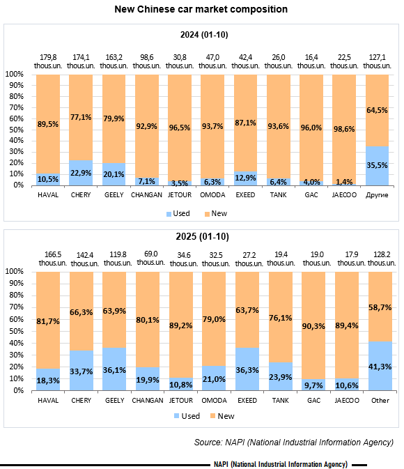 According to the marketing agency NAPI, 559.3 thousand new and 217.2 thousand used Chinese cars were sold in January-October 2025. Compared to the similar period of 2024, sales of new Chinese cars decreased by 27.6%, while those of used ones grew by 39.3%.