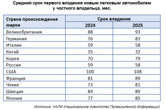 Маркетинговое агентство НАПИ проанализировало средние сроки первого владения новыми легковыми автомобилями в 2024-2025 годах у частных владельцев.