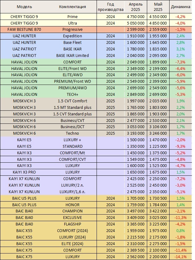 Маркетинговое агентство НАПИ проанализировало рекомендованные розничные цены (РРЦ) на новые легковые автомобили в мае 2025 г. По сравнению с апрелем 2025 г. изменились цены на 51 комплектацию. Снизились цены на 37 комплектаций CHERY, FAW, HAVAL, KAIYI, BAIC, HONGQI. Снижение цен составило от 1,5% до 16,9%. Цены на 14 комплектаций UAZ, MOSKVICH, KAIYI, BAIC в мае выросли, прирост составил от 0,8% до 3,1%.