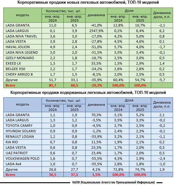По данным маркетингового агентства НАПИ, продажи новых легковых автомобилей корпоративным клиентам по итогам января-апреля 2025 года упали на 29,3%. В то же время продажи подержанных автомобилей увеличились на 1,5%. На рынке новой техники первые четыре строчки рейтинга заняли модели LADA, самой популярной иномаркой стал HAVAL JOLION. На рынке подержанных автомобилей первое и второе место заняли LADA GRANTA и LADA LARGUS, самой популярной иномаркой стала TOYOTA CAMRY. В десятку лидеров ни один китайский автомобиль пока не вошел.