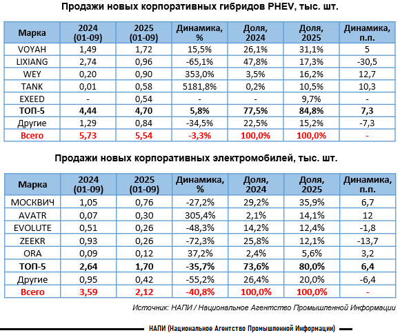 По данным маркетингового агентства НАПИ, в январе-сентябре 2025 года было продано 5,54 тыс. новых корпоративных гибридов PHEV, что на 3,3% меньше, чем за аналогичный период 2024 года. Наибольшая доля продаж в текущем году приходится на VOYAH (31,1%). В то же время доля лидировавшего в прошлом году LIXIANG сократилась на 30,5 п.п. до 17,3%. Рост продаж показали WEY и TANK, их доля увеличилась до 16,2% и 10,5% соответственно.