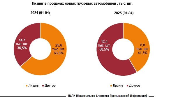 Рынок новых грузовиков в январе-апреле 2025 года сократился не так сильно - на 47,6%. В результате доля лизинговых грузовых автомобилей снизилась с 63,5% до 41,5%.