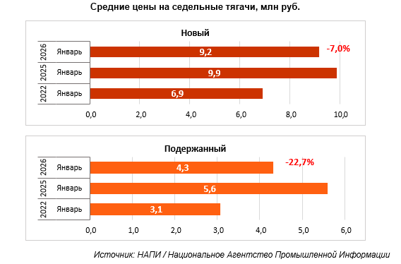 В январе 2026 года снизились цены на новые тягачи, стоимость техники составила 9,2 млн рублей (-7%). Значительнее сократилась средняя цена на подержанную технику, стоимость тягача снизилась до 4,3 млн рублей (-22,7%).