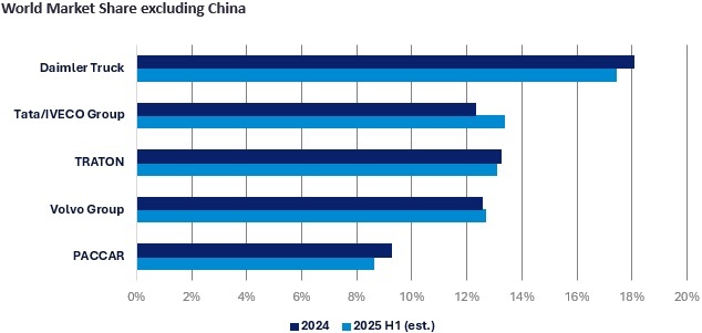 Согласно заключению аналитиков GlobalData, это слияние сформирует новую группировку, которая по доле на мировом рынке грузовых автомобилей и годовым производственным мощностям будет сопоставима с TRATON и Volvo Group. Действительно, сочетание спада на рынке США и стабильного спроса в Индии вылилось в межрегиональное перераспределение продаж, в результате которого совокупная доля Tata/IVECO на мировом рынке (за исключением Китая) по итогам первой половины 2025 года приблизилась к вершине рейтинга, уступив лишь лидеру мирового рынка – Daimler.