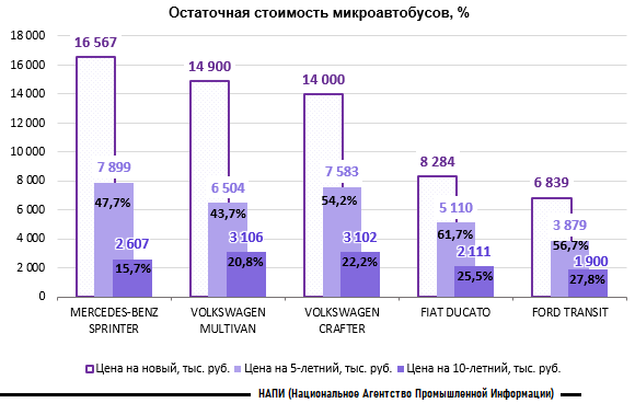 Маркетинговое агентство НАПИ (Национальное Агентство Промышленной Информации) обновило отчет «Остаточная стоимость LCV»* по итогам 2 квартала 2025 г. Среди представленных на графике 5-летних микроавтобусов дороже всего в прошлом квартале текущего года можно было продать MERCEDES-BENZ SPRINTER, средняя цена которого составляла 7 899 000 руб. Аналогично среди 10-летних выше всего цена была на VOLKSWAGEN MULTIVAN – 3 106 000 руб. При этом лидером по сохранности остаточной стоимости по отношении к цене нового автомобиля через 5 лет эксплуатации стал FIAT DUCATO. Так, для покупки нового FIAT DUCATO после продажи 5-летнего микроавтобуса той же модели, владельцу необходимо было доплатить всего 38,3% от его цены во 2 квартале 2025 г. Через 10 лет по сохранности остаточной стоимости по отношении к цене нового микроавтобуса во 2 квартале 2025 года лидировал FORD TRANSIT. Продав 10-летний микроавтобус, владелец мог приобрести новый FORD TRANSIT, доплатив 72,2% от его цены во 2 квартале 2025 г.