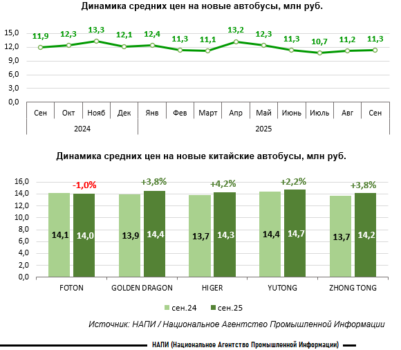 По данным маркетингового агентства НАПИ, средняя цена на новые автобусы* за год, с сентября 2024 по сентябрь 2025 года, снизилась на 5,3% (с 11,9 млн рублей до 11,3 млн рублей). За месяц, с августа по сентябрь текущего года, цена выросла на 0,5%. Несмотря на общегодовое снижение, средние цены на ряд новых автобусов китайских брендов выросли. Так, стоимость HIGER увеличилась на 4,2%, ZHONG TONG и GOLDEN DRAGON – на 3,8%, YUTONG – на 2,2%. Снизилась цена лишь на FOTON (-1%). В среднем китайские автобусы подорожали на 322 тыс. – 573 тыс. рублей.