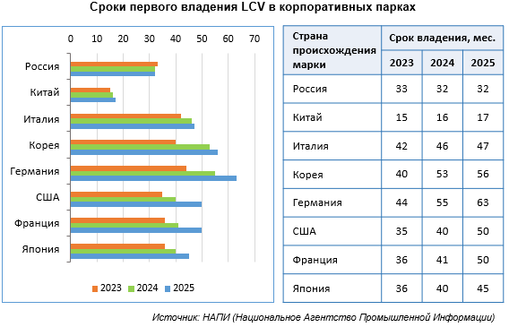 Маркетинговое агентство НАПИ проанализировало средние сроки первого владения LCV* корпоративными клиентами в 2023-2025 годах.