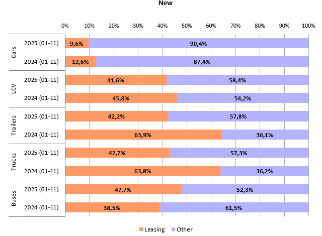 За одиннадцать месяцев текущего года доля подержанных автомобилей, взятых в лизинг, выросла во всех сегментах: автобусы (+3,8 %), прицепы (+2,4 %), грузовики (+2,2 %), малотоннажные автомобили (+0,3 %) и легковые автомобили (+0,1 %).