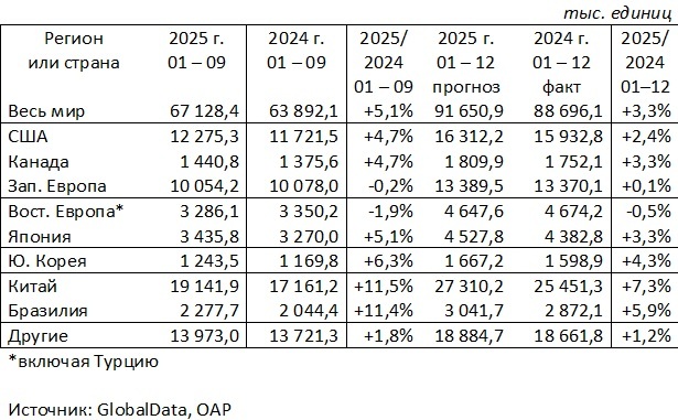Мировые продажи легких автомобилей в январе-сентябре 2025 года