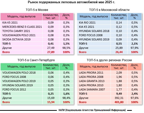 Маркетинговое агентство НАПИ проанализировало какие подержанные автомобили пользовались наибольшим спросом в различных регионах России в мае 2025 года. Так в пятерку лидеров в Москве не вошел ни один российский автомобиль, но вошел четырехлетний MERCEDES-BENZ E-CLAS . Кроме того, москвичи охотно покупали «свежие» автомобили, так в пятерке лидеров - четыре четырехлетних автомобиля. В Московской области в ТОП-5 также не вошел ни один российский автомобиль, четырехлетних автомобилей – всего два. Ни один премиальный автомобиль в пятерку лидеров не попал. В Санкт-Петербурге в пятерке лидеров также нет ни одного российского автомобиля, наибольшим спросом пользовались более возрастные иномарки массового ценового сегмента. В остальных регионах России лучше всего покупают «возрастные» российские автомобили. В пятерку лидеров не вошла ни одна иномарка, самому «молодому» автомобилю - двенадцать лет.