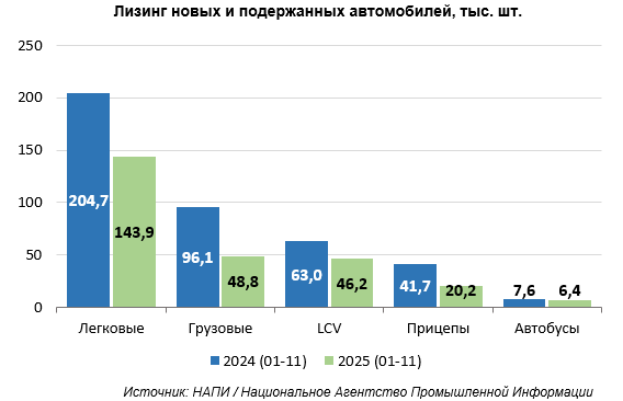 По данным маркетингового агентства НАПИ, за январь-ноябрь 2025 года было приобретено в финансовый и операционный лизинг 265,5 тыс. новых и подержанных автомобилей, что на 35,7% меньше, чем за аналогичный период 2024 года. Из них в лизинг было выдано 188,6 тыс. ед. новых автомобилей (-45,4% по сравнению с прошлым годом) и 76,9 тыс. – подержанных (+13,4%).