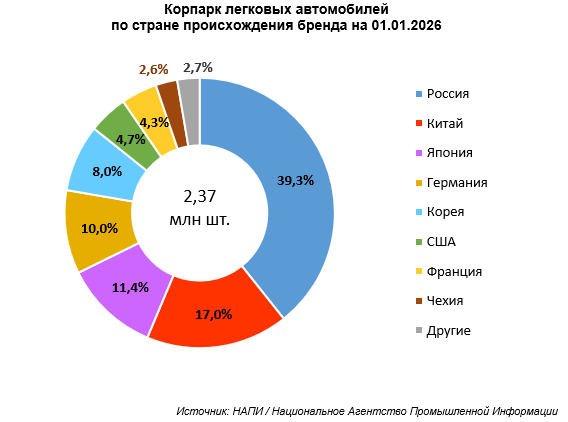 По данным маркетингового агентства НАПИ, в корпоративном парке легковых автомобилей на 01.01.2026 года насчитывается 2,4 млн единиц техники.