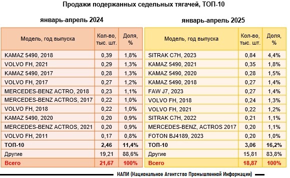 Маркетинговое агентство НАПИ проанализировало продажи подержанных седельных тягачей. В январе-апреле 2025 года в десятку лидеров вошли двух и трех летние китайские модели. В январе-апреле прошлого года в десятку лидеров двухлетние тягачи не входили, но вошло два трехлетних - VOLVO FH и MERCEDES-BENZ ACTROS.