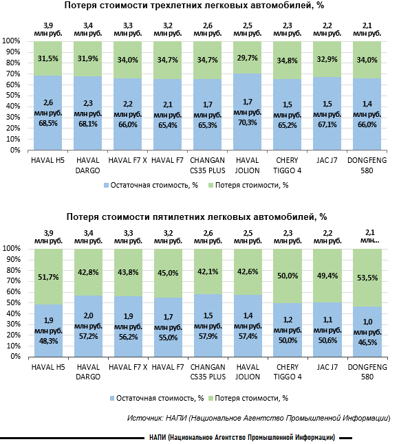 Лидером по сохранности остаточной стоимости по отношению к цене нового легкового автомобиля через три года эксплуатации стал HAVAL JOLION. Продав трехлетний автомобиль, владелец мог приобрести новый HAVAL JOLION, доплатив всего 29,7% от его цены в 3 квартале текущего года. Через пять лет эксплуатации лучшим по сохранности остаточной стоимости по отношению к цене нового автомобиля стал CHANGAN CS35 PLUS. Продав пятилетний легковой автомобиль, владелец мог приобрести новый CHANGAN CS35 PLUS, доплатив 42,1% от его цены в прошлом квартале.