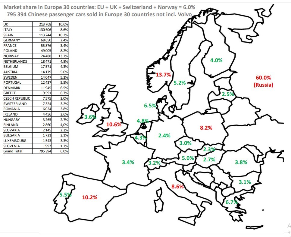 Наиболее высокие доли китайские автомобили заняли на следующих национальных рынках в рамках упомянутого региона: в Норвегии (13,7%), Великобритании (10,6%), Испании (10,2%), Италии (8,6%) и Польше (8,2%).