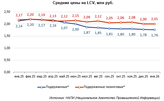 C января 2025 по январь 2026 года, средние цены на подержанные LCV колебались от 1,8 млн рублей до 2,2 млн рублей. В то же время лизинговые цены колебались от 2,0 млн рублей до 2,2 млн рублей. Своего минимума средние цены достигли в январе 2026 года, а лизинговые цены – в декабре 2025 года. Дороже всего те и другие LCV продавались в феврале 2025 года.