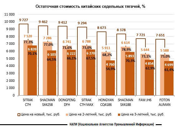 Маркетинговое агентство НАПИ (Национальное Агентство Промышленной Информации) обновило отчет «Остаточная стоимость грузовых автомобилей» по итогам 2 квартала 2025 г. Среди представленных на графике двухлетних и трехлетних китайских седельных тягачей дороже всего в прошлом квартале текущего года можно было продать SITRAK C7H, средняя цена которого составляла 7 520 000 руб. и 6 820 000 руб. соответственно. В тот же период лидером по сохранности остаточной стоимости по отношении к цене нового автомобиля через 2 года эксплуатации стал SHACMAN SX4188. Так, для покупки нового SHACMAN SX4188 после продажи двухлетнего тягача той же модели, владельцу необходимо было доплатить лишь 21,1% от его цены во 2 квартале 2025 г. Через 3 года по сохранности остаточной стоимости по отношении к цене нового во 2 квартале 2025 года тягача также лидировал SHACMAN SX4188. Продав трехлетний тягач, владелец мог приобрести новый SHACMAN SX4188, доплатив всего 29,7% от его цены во 2 квартале 2025 г. Стоит отметить, что цены на поддержанные тягачи колеблются в зависимости от ситуации со стоками автомобилей, количества вышедшей на рынок техники, а также приостановки Росстандартом действия одобрения типа транспортных средств. Оценить степень влияния ряда факторов, в том числе вводимых госорганом мер, на стоимость китайских тягачей можно будет уже в 3 квартале 2025 года.