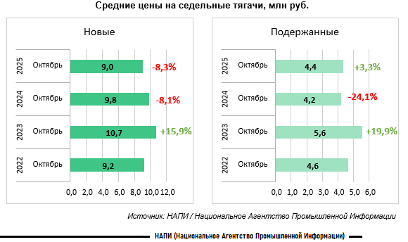 Маркетинговое агентство НАПИ проанализировало динамику средних цен на новые и подержанные* седельные тягачи. Значительнее всего стоимость тягачей выросла в 2023 году. Так, в октябре стоимость нового тягача увеличилась на 15,9%, подержанного – на 19,9%. В октябре 2024 года средняя цена на новый тягач снизилась на 8,1%, а на подержанный сильнее – на 24,1%. В октябре текущего года немного упали в цене новые тягачи, стоимость техники составила 9 млн рублей (-8,3%). В то же время средняя цена на подержанную технику немного выросла, стоимость тягача достигла 4,4 млн рублей (+3,3%). За три года, с октября 2022 года по октябрь 2025 года, новые седельные тягачи в среднем подешевели на 2,3%, подержанные – на 6,1%.