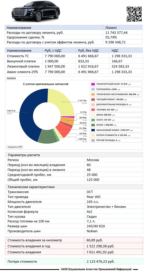 В качестве примера НАПИ рассчитало стоимость владения легковым автомобилем HONGQI H9 Deluxe, приобретенным в лизинг в корпоративном парке в городе Москва с использованием онлайн калькулятора стоимости владения DV – TCO.