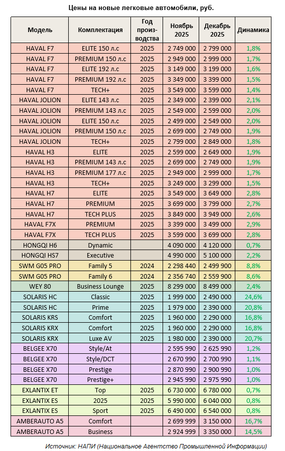 В цене выросли комплектации моделей HAVAL, HONGQI, SWM, WEY, SOLARIS, BELGEE, EXLANTIX и AMBERAUTO. Прирост составил от 0,7% до 24,6%.