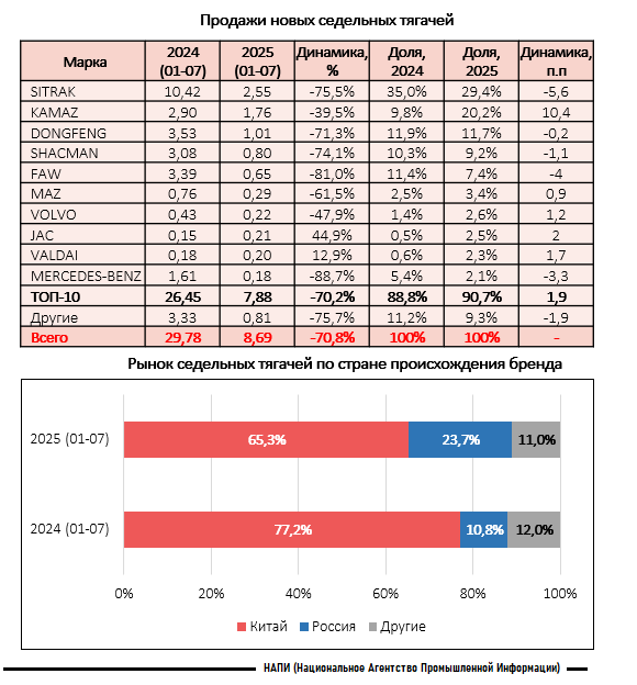 По данным маркетингового агентства НАПИ, в январе-июле 2025 года было продано 8,7 тыс. новых седельных тягачей, что на 70,8% меньше, чем за аналогичный период 2024 года. Хотя введенные в июле Росстандартом ограничения еще не успели сказаться на рынке, его общее падение привело к снижению продаж китайских марок, в том числе вошедших в десятку лидеров Dongfeng (-71,3%), Sitrak (-75,5%) и FAW (-81,0%). При этом доля российской техники в период падения рынка традиционно растет, за год она увеличилась в два раза. Доля KAMAZ, как одного из ведущих отечественных производителей, за год поднялась на 10,4 п.п. (до 20,2%). Несмотря на санкции, продолжают поставляться европейские тягачи, в ТОП-10 наиболее востребованных марок вошли шведский VOLVO и немецкий MERCEDES-BENZ. Стоит отметить, что значительное количество седельных тягачей было продано в 2023-2024 годах, поэтому спрос на них в текущем году рухнул. Кроме того, с начала 2025 года наблюдается тенденция к продаже лизинговыми компаниями свежей подержанной техники дешевле, чем остальными участниками рынка. Таким образом, потребителю становится выгоднее приобрести двух-трехлетний тягач вместо нового.