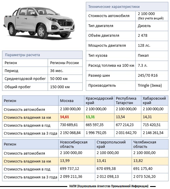 Маркетинговое агентство НАПИ проанализировало стоимость владения пикапом AMBERTRUCK WORK в 8 регионах из всех Федеральных Округов России с использованием онлайн калькуляторастоимости владения DV – TCO.
