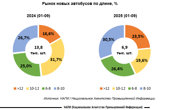 По данным маркетингового агентства НАПИ, за январь-сентябрь 2025 года было продано 6,9 тыс. ед. новых автобусов, что на 50,1% меньше, чем годом ранее, когда было реализовано 13,8 тыс. автобусов.
