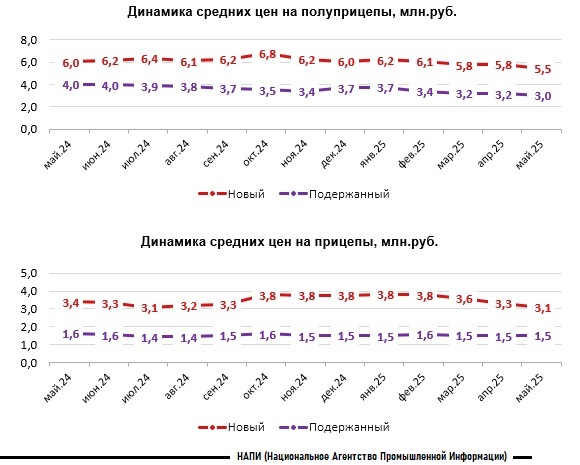 Маркетинговое агентство НАПИ проанализировало динамику средних цен на новые и подержанные* прицепы и полуприцепы. За год, с мая 2024 по май 2025 года, средняя цена на новые полуприцепы снизилась на 9,4%, средняя цена на подержанные полуприцепы упала на 24,1%. Новые прицепы за год в среднем подешевели на 8,5%, подержанные прицепы – на 7,7%.