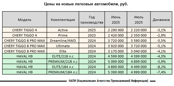 Маркетинговое агентство НАПИ проанализировало рекомендованные розничные цены (РРЦ) на новые легковые автомобили в июле 2025 года. По сравнению с июнем текущего года изменились цены на 101 комплектацию. Снижение цен коснулось 96 комплектаций CHERY, HAVAL, GAC, EXEED, OMODA, TANK, HONGQI, WEY и составило от 0,7% до 12,9%. Выросли цены на 5 комплектаций EXEED и MOSKVICH, прирост составил от 2,4% до 3,4%. В июле больше всего подешевела модель HONGQI HS3 Comfort (с 3 090 000 до 2 690 000 рублей). Наиболее подарожавшей стала модель EXEED VX PRESIDENT 6 (с 5 940 000 млн до 6 140 000 рублей).