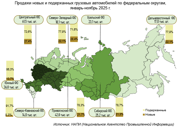 По данным маркетингового агентства НАПИ, за январь-ноябрь 2025 года было продано 239,3 тыс. новых и подержанных грузовых* автомобилей, что на 22,6% меньше, чем годом ранее, когда было реализовано 309 тыс. грузовиков. Так, продажи подержанной техники сократились на 4,5%, а новой упали на 53,3%.